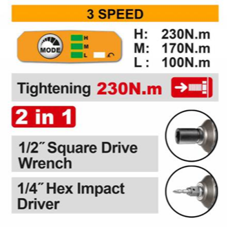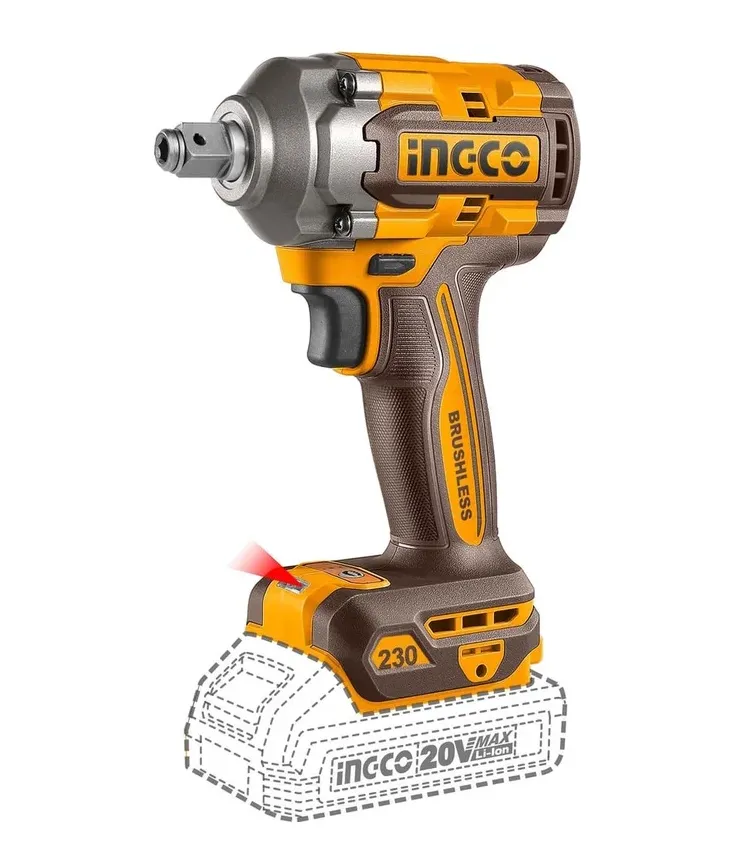 Аккумуляторный бесщеточный ударный гайковерт, импульсный винтоверт INGCO CIWLI20236 20 В 1/2" 1/4" 230 Нм применяется для закручивания и откручивания болтов, гаек, саморезов за счет держателя 2 в 1. Ручной гайковерт IMPACT имеет 3 режима скорости и изменение направления вращения (реверс), квадратный привод 12.7 мм (1/2") и внутренний шестигранник 1/4".