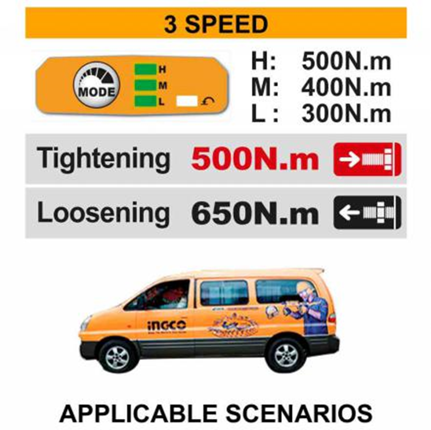 Аккумуляторный бесщеточный ударный гайковерт INGCO CIWLI2050 INDUSTRIAL 20 В 1/2" 500 Нм применяется для закручивания и откручивания болтов или гаек. Ручной гайковерт имеет 3 режима скорости и изменение направления вращения (реверс), квадратный привод 12.7 мм (1/2").