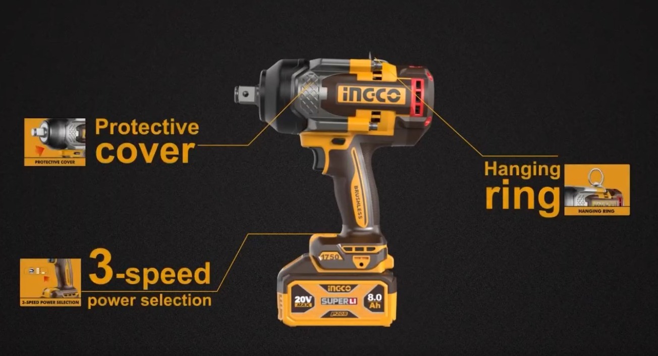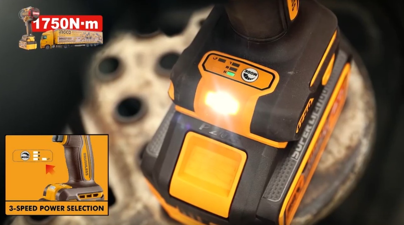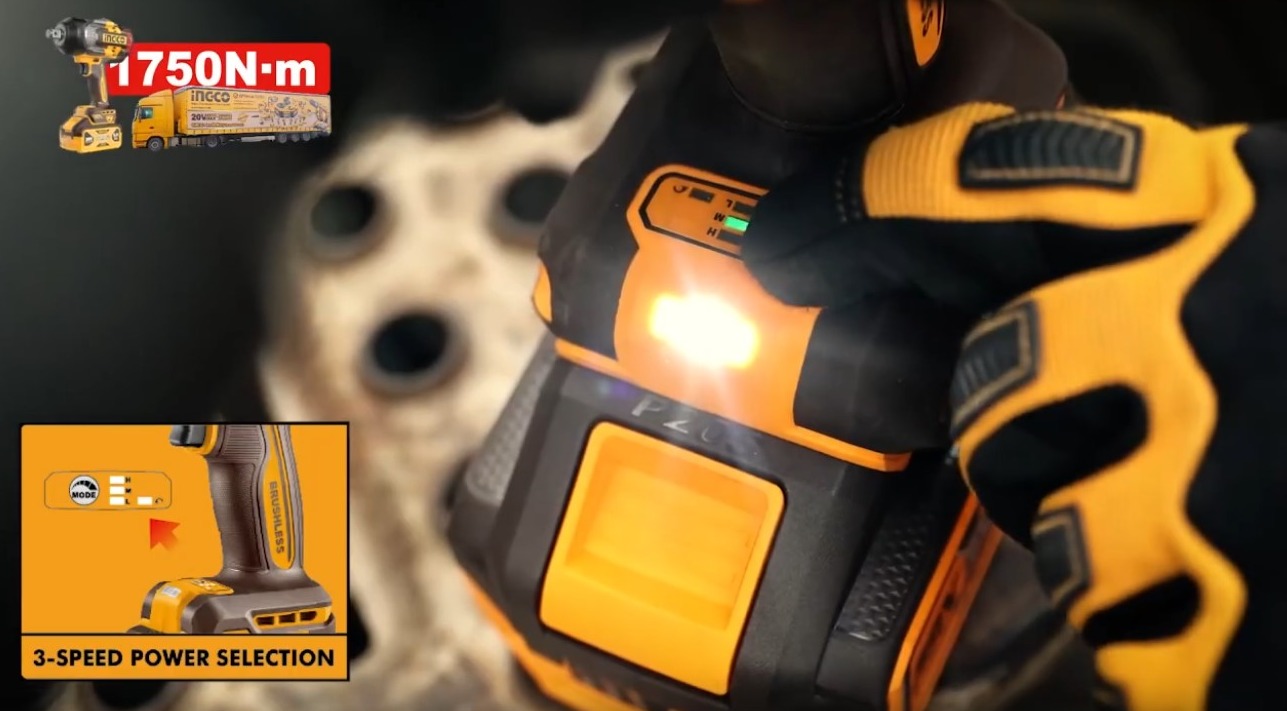 Аккумуляторный бесщеточный ударный гайковерт INGCO CIWLI201751 INDUSTRIAL 20 В 1/2" 1750 Нм / 2100 Нм применяется для закручивания и откручивания болтов или гаек. Ручной гайковерт имеет 3 режима скорости и изменение направления вращения (реверс), квадратный привод 19,05 мм (3/4").