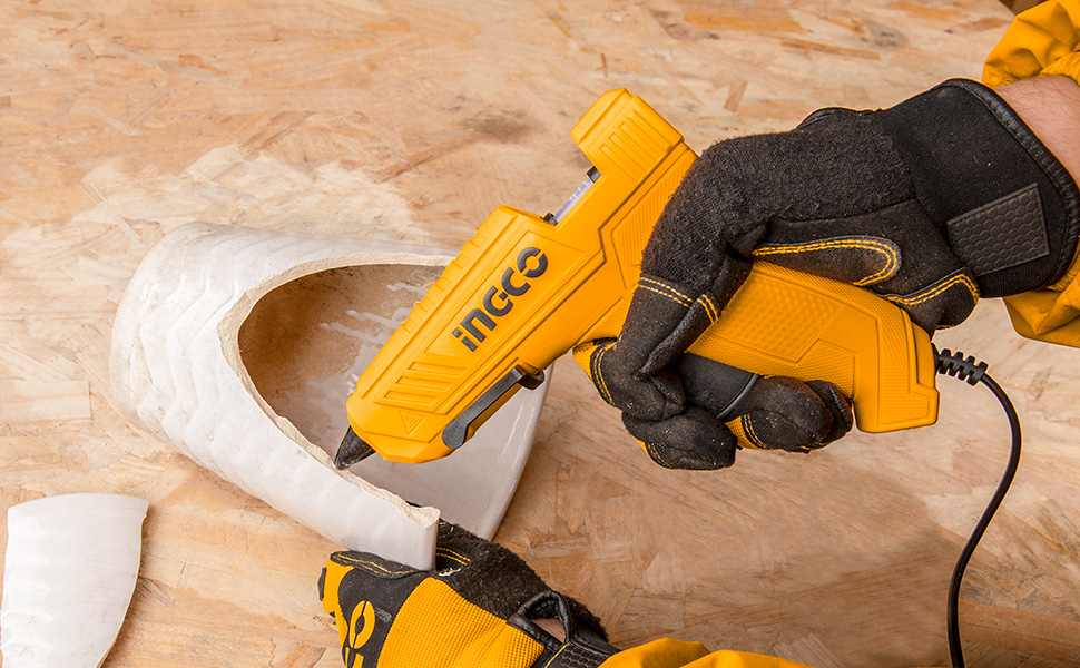 Клеевой пистолет INGCO GG148 используется для склеивания различных материалов: бумаги, кожи, текстиля, картона, пластика, дерева, металла, пробки и камня.