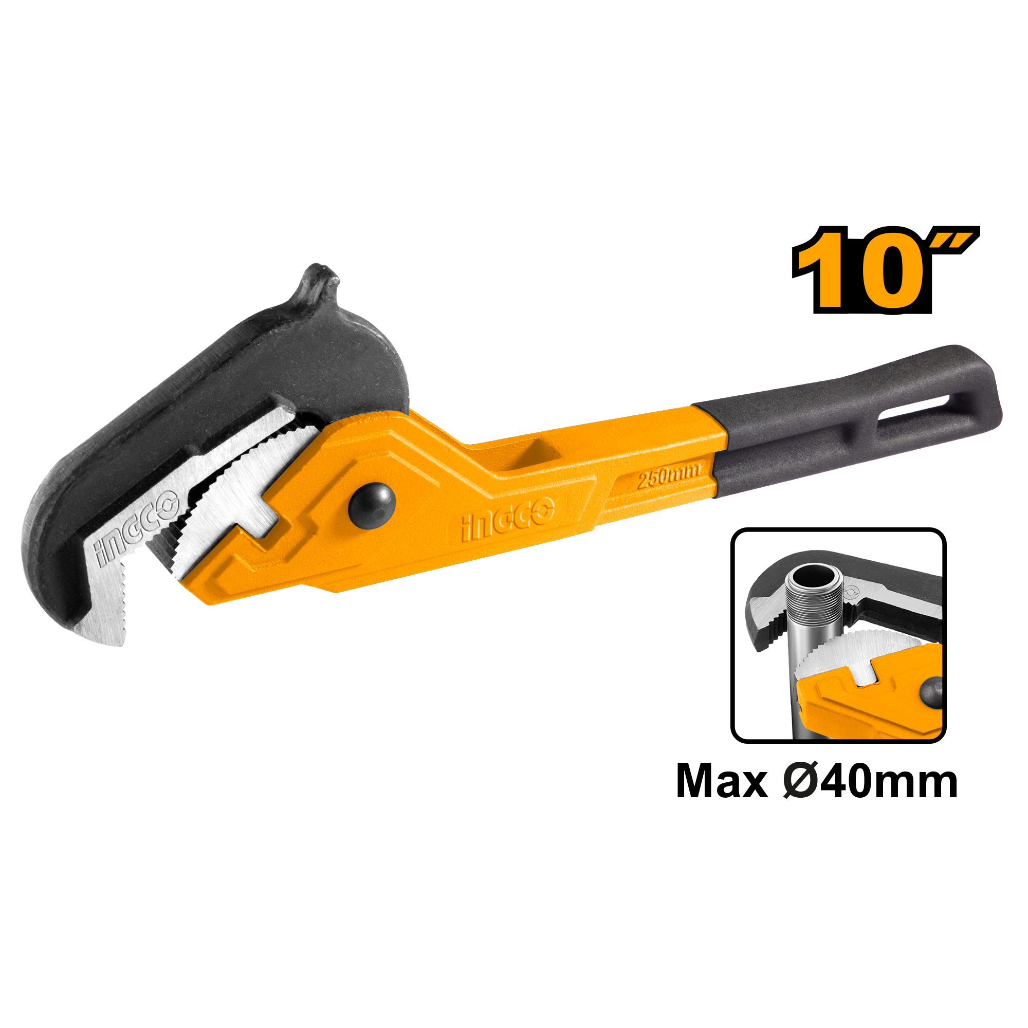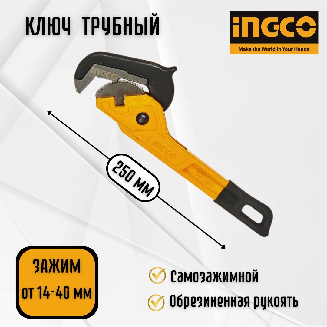 Ключ универсальный самозажимной INGCO HPW1410 INDUSTRIAL 250 мм 14-40 мм имеет специальный механизм, который существенно облегчает захват крепежа. Инструмент удобен за счет профилированной обрезиненной рукояти.