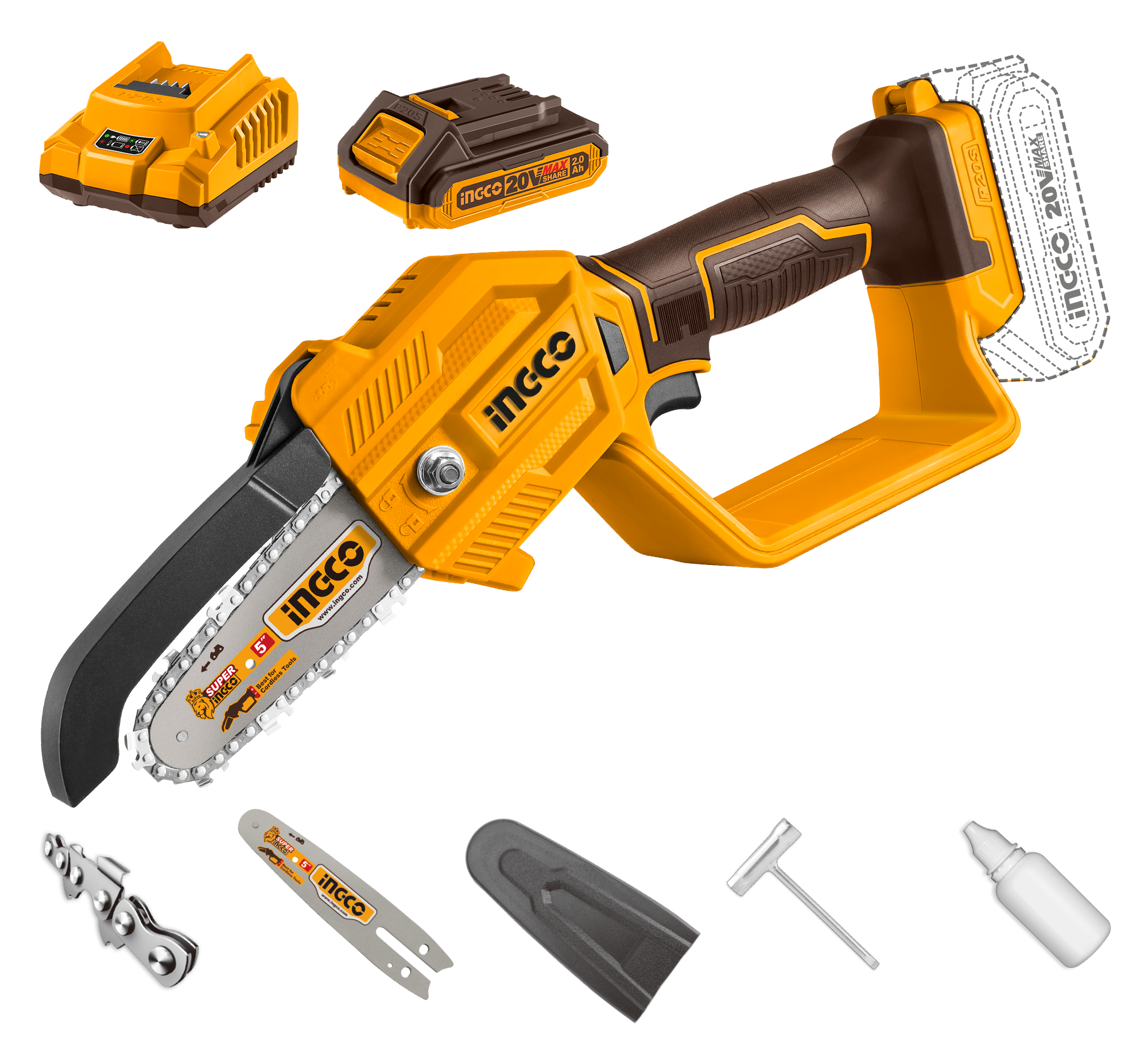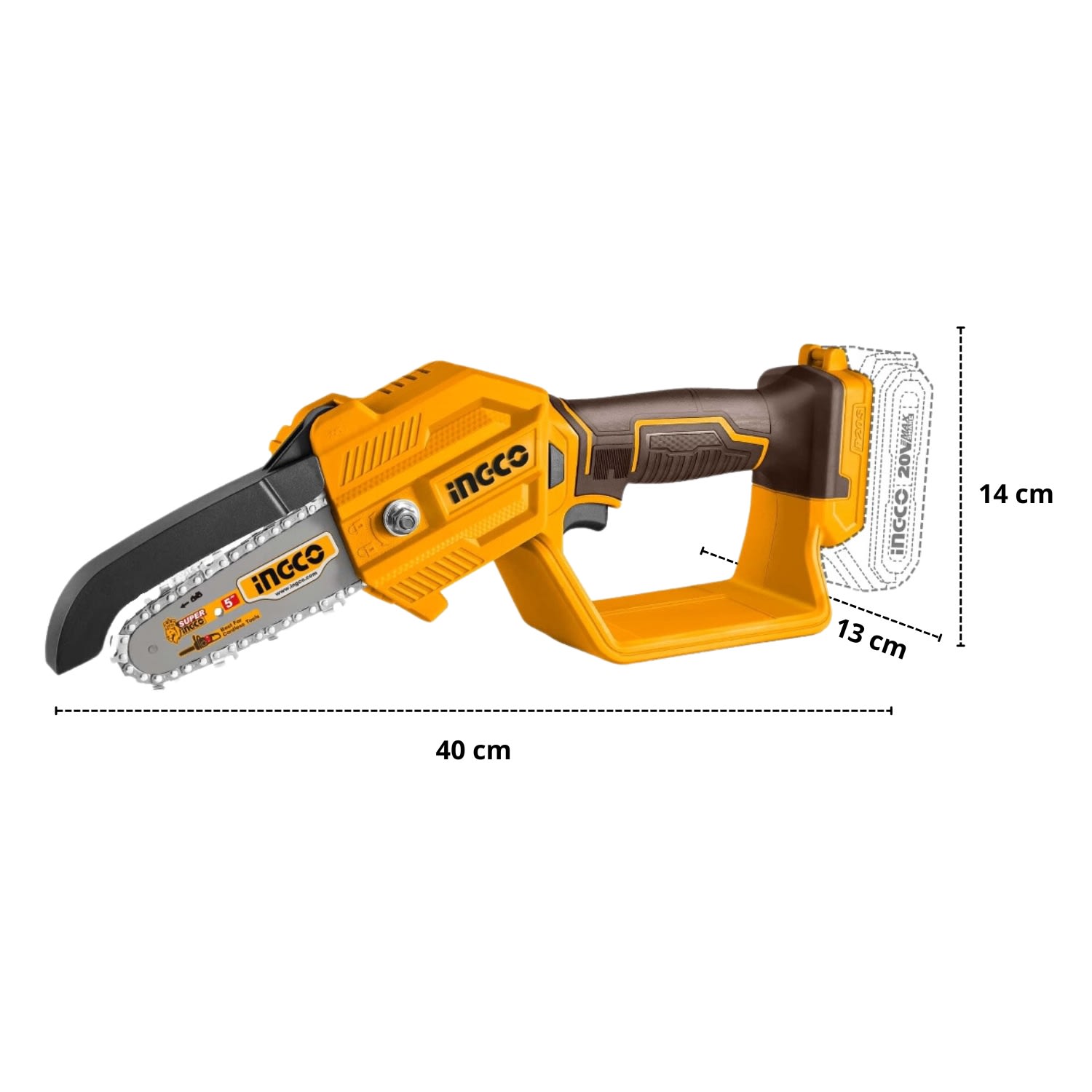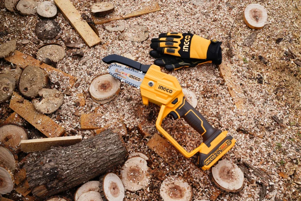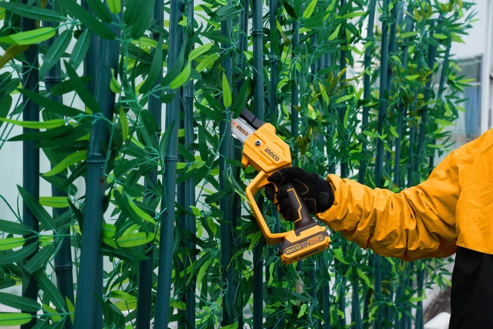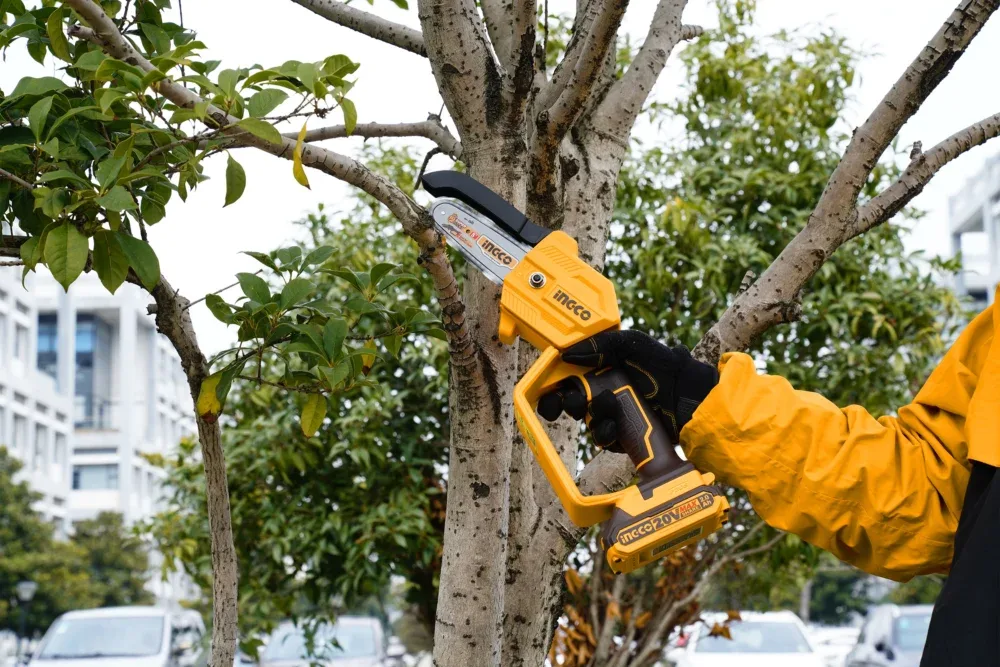 Аккумуляторная цепная мини пила INGCO CGSLI20581 20 В специально разработана для работы в саду при уходе за растущими деревьями и работ в кроне дерева, распила и обрезания веток деревьев.