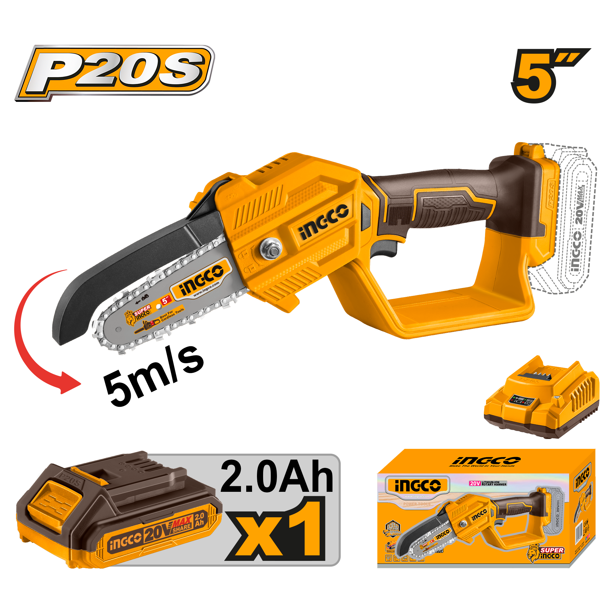 Комплектация: Цепная пила - 1 шт., аккумуляторная батарея 2.0 Ач. - 1 шт., зарядное устройство 2.0 А - 1 шт., цепь 127 мм. (INGCO AGSC5051) - 1 шт., шина 127 мм. (AGSB50501) - 1 шт., ключ 3 в 1 13 мм + отвертка для регулировки цепи 100х6 мм + затяжка шины 10 мм - 1 шт., масленка - 1 шт., инструкция, гарантийный талон.