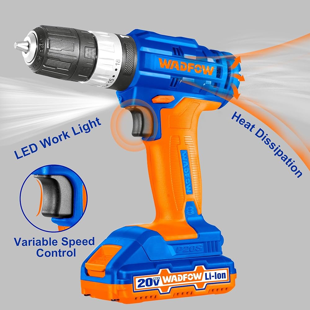 Шуруповерт аккумуляторный ударный WADFOW WCDP522 20 В 35 Нм предназначен для сверления отверстий в пластике, древесине, металле, закручивания саморезов, винтов и прочих крепёжных элементов при сборке мебели, монтаже конструкций, выполнении ремонтных, строительных и отделочных работ как внутри зданий, так и на улице.