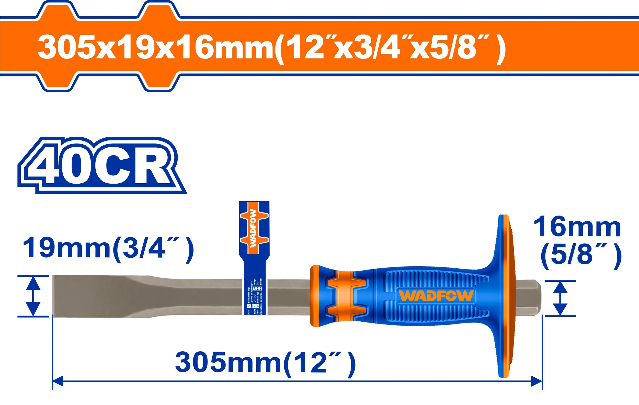 Зубило плоское с протектором WADFOW WCC2311 19х16х305 мм используется для раскалывания кирпича, блоков из газосиликата и пенобетона, а также иных строительных материалов.